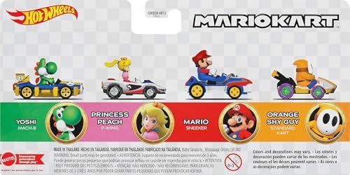 Hot Wheels Mario Kart Vehículo de Juguete 4-Pack, Set Coleccionista de 4 Personajes Favoritos de los Fans Incluye Shy Guy Naranja de Primera Aparición