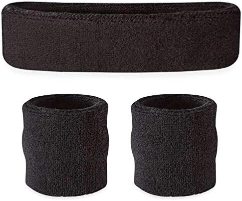 Suddora Black Sweatband Set - (1 Headband and 2 Wristbands) - Athletic Cotton Terry Cloth Sweatbands for Sports