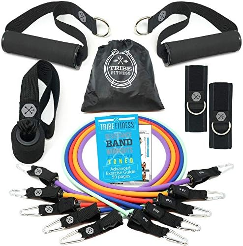 - PREMIUM SERIES RESISTANT FITNESS BANDS WITH ADJUSTABLE TENSION LEVEL. This 12 piece set includes 5 color-coded strength tension bands (10LB, 20LB, 30LB, 40LB, 50LB), 2 cushioned handles, 1 door anchor, 2 ankle straps, 1 waterproof carry bag & an advanced exercise eBook (downloadable online).