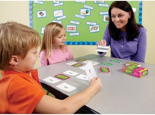 Los juegos de ritmo rápido proporcionan práctica para habilidades de lectura iniciales. Mientras el lector lee cada carta en voz alta, los jugadores escanean las cartas frente a ellos. Si dos cartas coinciden, el jugador dice "¡SPLAT!" y voltea las cartas. El primer jugador en voltear todas sus cartas gana. Tres mazos codificados por colores facilitan adaptar el juego para una práctica individual o para varios jugadores. Para 2-6 jugadores. Las cartas son de 3-1/2" x 2-1/4". El juego incluye 225 cartas: 75 cartas de llamada y 150 cartas de respuesta.