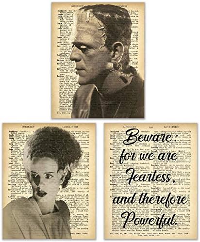 - Classic Frankenstein and Bride Poster: Celebrate timeless horror with this striking set of three (8x10 inch) unframed prints featuring iconic scenes from Frankenstein and his Bride. Each piece combines vintage dictionary backgrounds with modern art techniques, making them a must-have for any Universal Monsters fan.