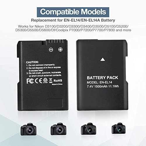 - 【Standard Compatibility】EN-EL14 replacement battery Works with Nikon models that use EN-EL14 & EN-EL14a batteries: D3100 / D3200 / D3300 / D3400 / D3500 / D5100 / D5200 / D5300 / D5500 / D5600 / P7000 / P7100 / P7700 / P7800 etc.