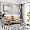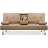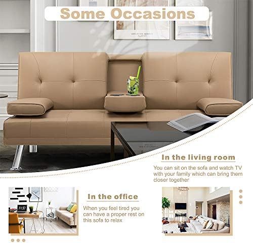 Walsunny Modern Faux Leather Couch, Convertible Futon Sofa Bed for Living Room with Armrest & Fold Up & Down Recliner Couch with Cup Holders (Champagne)