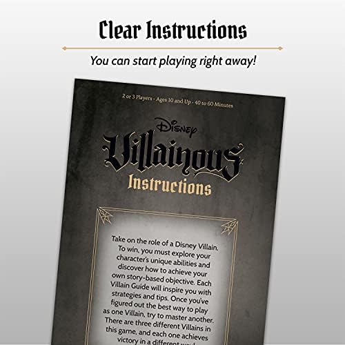 - Aprende con Instrucciones Claras o en Línea: Aprende a jugar con un libro de reglas paso a paso con diagramas y visuales claros, o busca en YouTube “Watch It Played Disney Villainous” para un tutorial en video. Cada Villano viene con su propia Guía de Villano que describe consejos, trucos y estrategias para ganar. Busca “Cómo Jugar Disney Villainous Remotamente” y aprende a jugar con amigos y familiares a través de una webcam!
