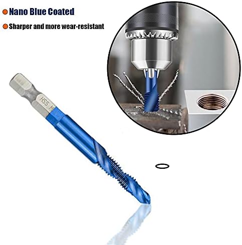 - 【Material de alta calidad】El juego de brocas y roscados combinado ASDTODW está hecho de HSS de alta calidad con revestimiento azul nano, alta dureza, anti-óxido, tiene excelente capacidad y durabilidad. Este juego de brocas puede perforar, roscar, desbarbar y contrataladrar rápidamente.
