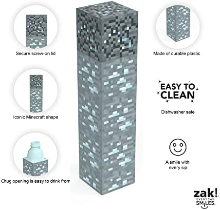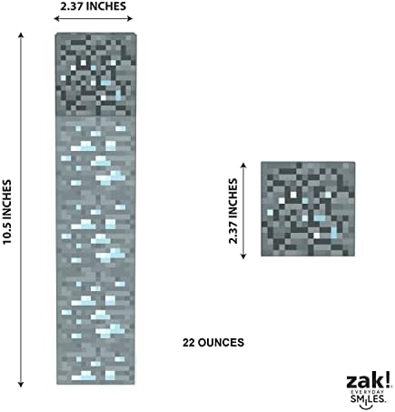 - Tamaño: esta botella de agua Zak Minecraft con forma de diamante tiene una capacidad de 22 onzas, mide 10.5 pulgadas de alto y 2.37 por 2.37 pulgadas de ancho.