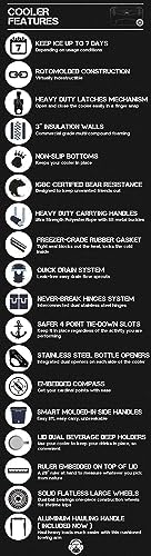 - IGBC Certified Bear Resistant, designed to keep unwanted friends out · Embedded Compass, get your cardinal points with ease · 4 Tie-Down Slots to keep the cooler secured · Leak-Free Rugged Full Length Drain System, drains your cooler fast and easy · Ultra-Strength Polyester Rope · Removable Smart Carrying Handles · Solid Flatless Large Wheels with Dual Ball Bearings for a haulings · (OPTIONAL ACCESSORY) Aluminum Cushioned Hauling Handle to haul heavy load much easier ( 20)