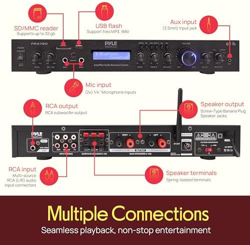 - CONNECT TO EXTERNAL DEVICES: The rack mount home theater amp features USB flash and SD memory card readers, as well as a 3.5mm aux input jack and multi-source RCA audio input connectors