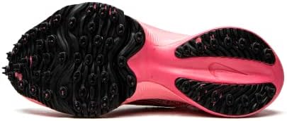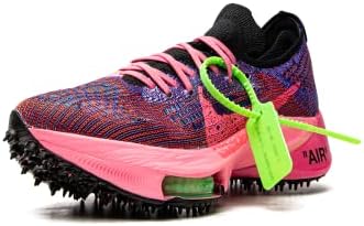 The Off-White Air Zoom Tempo Next% features a Flyknit upper, Swoosh on side panels, flat-woven laces with toggle and tag, nylon heel pull, Nike Zoom Air unit, and spikey rubber outsole. Available in Racer Blue / Black / Pink Glow color and made of Flyknit material. Style: NKCV0697-400.