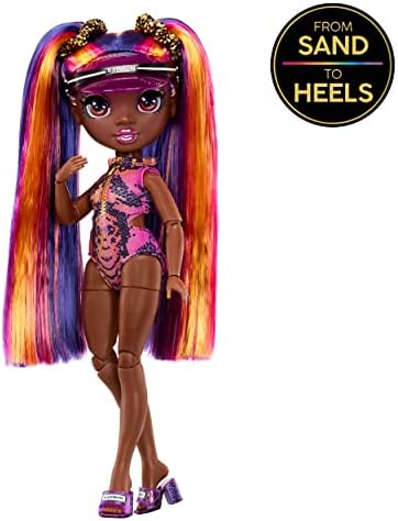 Rainbow High Pacific Coast Phaedra Westward- Sunset (Púrpura) Muñeca de Moda con 2 Trajes de Diseñadora, Accesorios de Piscina, Pies Intercambiables