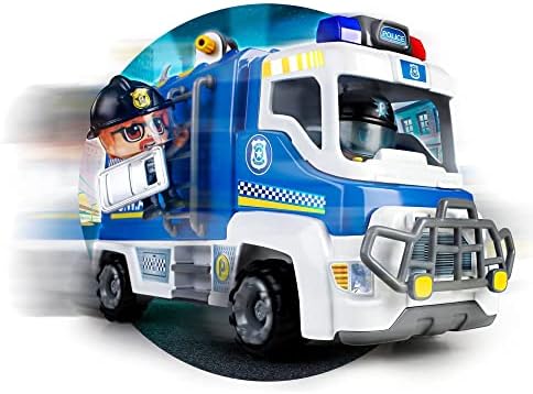 - Action-packed truck for hours of fun: jail with enough room for 2 thieves, cabin where two cops can go ready to take action, hidden drawer in base to store all accessories