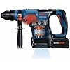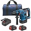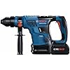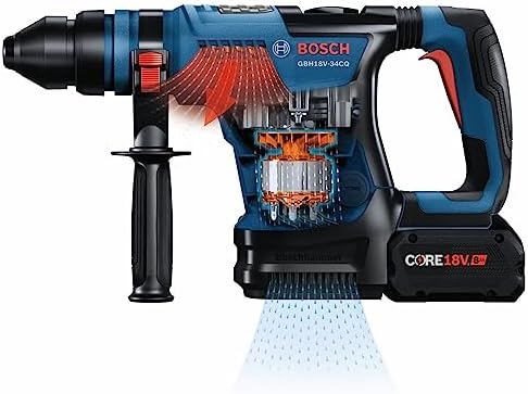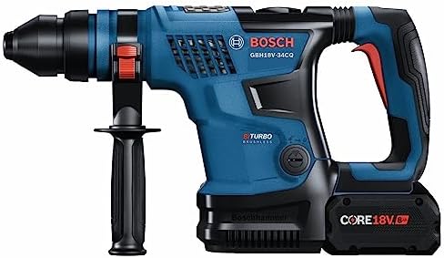 This 18V SDS-plus® Bulldog™ 1-1/4 In. rotary hammer is powerful enough to provide corded-type performance for tackling heavy-duty concrete drilling or chiseling jobs. The Bosch GBH18V-34CQ Rotary Hammer delivers 4.3 Ft.-Lbs. of impact energy (EPTA). That is unprecedented for a single 18V battery-driven SDS-plus® 1-1/4 In. rotary hammer. It weighs 10.8 Lbs. (tool only, not including battery). This hammer is part of the PROFACTOR™ System, which pairs BITURBO Brushless™ Technology with a CORE18V® High Power Battery. BITURBO Brushless™ Technology is a high-performance motor and drive-train system designed to deliver power comparable to high-demand corded tools. The anti-vibration system helps reduce vibration with a longer air cushion in the hammer tube and dampeners in the handle. The hammer has KickBack Control, a quick-release chuck, rotary hammer and hammer-only modes, a reverse setting and Vario-Lock to rotate and lock the chisel. The hammer features an on-tool user interface for tool performance, feedback and control. It has connectivity (module sold separately) to link to connected device via Bosch Toolbox App to customize settings and receive detailed feedback. The kit includes two CORE18V® 8 Ah High Power Batteries, which each deliver 50% more runtime and over 75% more power than the CORE18V® 4 Ah battery, powering high-demand applications. The GAL18V-160C battery turbo charger provides 16-amp charging current for fast and faster charging, with an optional Power Boost™ mode.