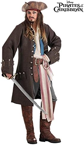 Channel your inner pirate with the Jack Sparrow Pirate Costume for Men from Disney's Pirates of the Caribbean, the ultimate outfit for adventure-seekers and movie fans alike. This authentic ensemble brings to life the cunning and carefree spirit of Captain Jack Sparrow, letting you step right into his legendary boots. Crafted with meticulous detail, the costume includes a heathered brown jacket with antique silver dome buttons down the front, capturing Jack’s rugged, yet charismatic style. The jacket drapes dramatically over an attached slate-blue vest, creating the layered, sea-worn appearance of a true swashbuckler. Designed for comfort and style, the Jack Sparrow Pirate Costume for Men includes a poly-cotton shirt front with adjustable ties to ensure a perfect fit, as well as gray jersey knit pants with an elastic waistband for ease of movement. Whether you’re navigating the high seas or just dancing your way through a costume party, this ensemble makes you feel ready to take on any adventure. The signature red patterned headscarf and fabric waist sash add a touch of pirate flair, while the classic tricorn hat—complete with three snap buttons to keep the sides in place—perfectly completes your transformation into the infamous captain of the Black Pearl. No pirate look is complete without the right accessories, and the Jack Sparrow Pirate Costume for Men delivers on all fronts. With brown belts featuring antiqued bronze belt holes and a matching buckle, plus a pair of boot tops designed to slide over your regular footwear, you’ll feel every bit the daring pirate. Whether it's Halloween, a costume party, or a fun photoshoot, this officially licensed Disney costume lets you live out your pirate fantasies with style and swagger. So, grab your compass, plot your course, and get ready to sail into thrilling adventures as the one and only Captain Jack Sparrow! - Jacket/Vest Combo - Shirt Front - Pants - Belt - Waist Sash - Head Scarf - Pair of Boot Tops - Hat