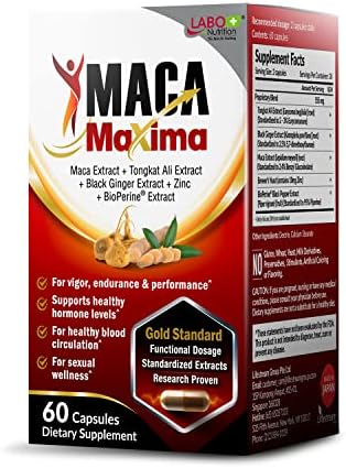 LABO Nutrition MacaMaxima Peruvian Maca Root, Tongkat Ali, Black Ginger, Zinc and Black Pepper Extract Supplement for Men and Women, Supports Reproductive Health, Energy, Stamina- Non-GMO, Vegan Pills