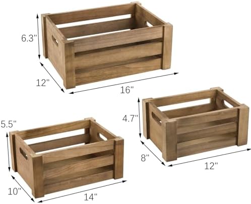 - Set of 3 wood crate, Large Crate: 16 x 12 x 6.3 inch, Medium Crate: 14 x 10 x 5.5 inch, Small Crate: 12 x 8 x 4.7 inch. Set of 3 wooden nesting crates are stackable and nest into one another for easy storage. Note: Please confirm the size before purchasing. Due to manual measurement, there may be slight errors