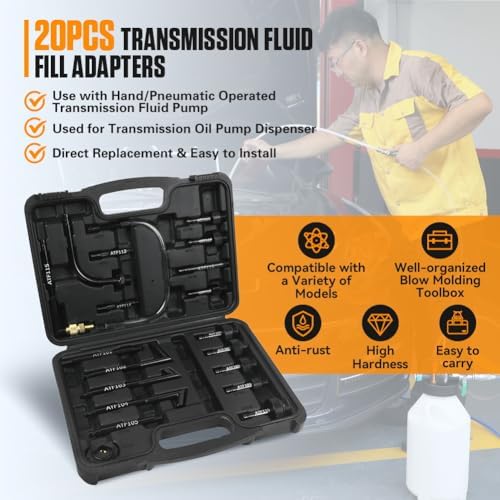 - 【Easy-carry & Well-organized Blow Molding Toolbox】Transmission fluid fill adapters come with a specially customized blow-molded toolbox with inlay storage, which can ensure that 20pcs ATF filler adapters are fixed in place for safe storage, easy organization and convenient transportation.
