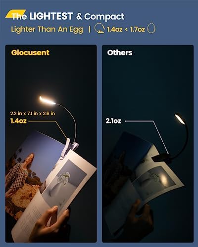 - [The LIGHTEST & Compact] This is the lightest amber book lamp and weighs 1.4oz ONLY, lighter than an egg. Unlike bulky book lights that can weigh down books and bend the pages, this book light is feather-light and won't cause any damage to your books. You can read and forget about the light resting on your book, immersing in the book with no interruptions. The compact design only needs a little space, which allows a good read at any time, anywhere.