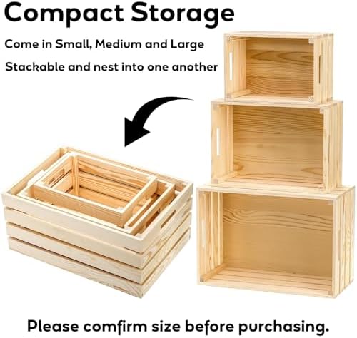 - Set of 3 Rustic Wooden Crates: The set includes 3 rustic wooden storage boxes, which is strong and durable. Small - 9.5 x 6.7 x 5.5, Medium - 12 x 8.6 x 5.5, Large - 14.6 x 10 x 6.6 inches(L X W X H). Each box is polished to a smooth finish and left in its natural wood grain. PLEASE CONFIRM SIZE BEFORE PURCHASING