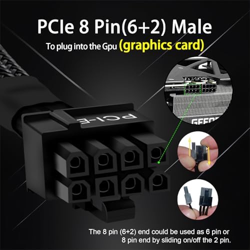 - Only designed for graphics vedio cards, it doesn't work with motherboards: Compatible with 6-pin & 8-pin graphics cards from regular manufacturers such as: ASUS/ASRock/Gigabyte/Radeon/Sapphire/NVIDIA Tesla/etc.(The 8 pin (6+2) ends could be used as 6 pin or 8 pin end by sliding on/off the 2 pin.);
