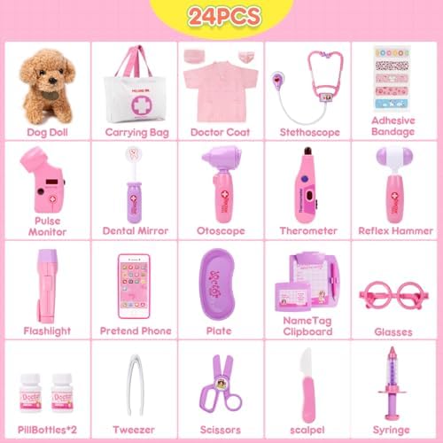 - Kit médico para niñas con juguetes de simulación para perros veterinarios. El set Meland Doctor Play incluye todas las herramientas imaginables que necesitará un futuro médico, como un bonito y esponjoso juguete para perros, una bata y un gorro de médico, una bolsa de transporte, un estetoscopio de juguete, una jeringa, un termómetro, unas pinzas, una bandeja, un espejo dental, un martillo médico, unas tijeras, anteojos, otoscopio, etc. Se trata de un estupendo kit de cirugía para principiantes, ideal para niñas a las que les gusta hacer juegos de simulación y ayudar a las que sueñan con ser doctoras.
