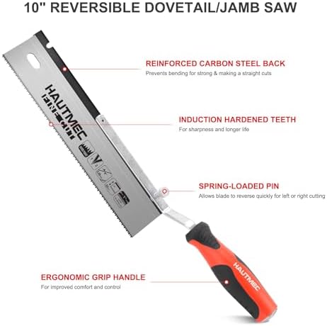 HAUTMEC 10" Reversible Dovetail Saw, Pro Flush Cut Jamb Saw, 12TPI Double Ground Teeth with Cranked Handle, Dual-Side Cutting Handsaw for Door Frames, Trim, and Flooring Installation – HT0234