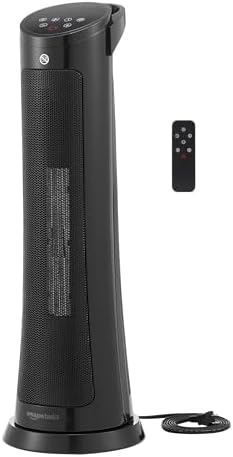 Amazon Basics 28-Inch Oscillating Tower Heater, With Over-Heat and Tip-Over Protection, 2 Heat Settings and Fan Mode, Timer, Remote Control, LED Display, 1500W, Black, 9.4"D x 9.4"W x 28.6"H