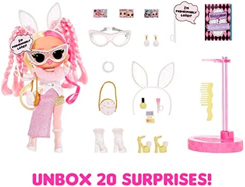- DESEMPAQUETA 20 SORPRESAS: Incluye una muñeca L.O.L. Surprise Tweens de moda, un deslumbrante traje de fiesta, una chaqueta de piel sintética, 2 pares de zapatos, un par de aretes, una bolsa de mano con temática de reloj, una máscara de mascarada, una diadema de orejas de conejo, un compacto de maquillaje, un pincel de maquillaje, un collar de piedras, un accesorio de fotomatón, un cepillo de pelo y un soporte para muñeca.