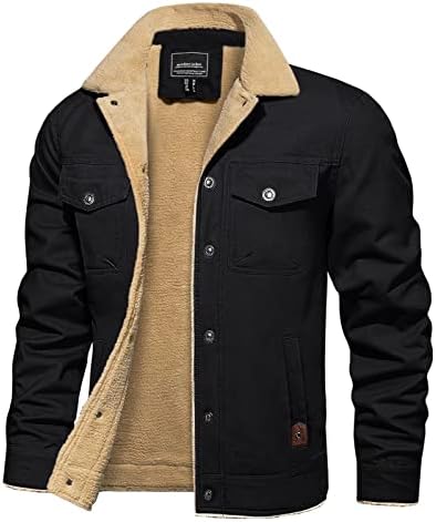 BIYLACLESEN Men's Sherpa Lined Trucker Jacket Lapel Cotton Cargo Jacket Casual Button Military Jacket Warm Winter Parka