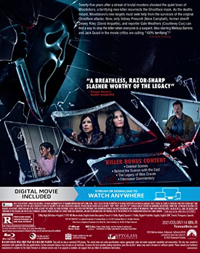 Veinticinco años después de que una racha de brutales asesinatos sacudiera la tranquila ciudad de Woodsboro, un nuevo asesino se puso la máscara Ghostface y comenzó a atacar a un grupo de adolescentes para resucitar secretos del pasado mortal de la ciudad. Neve Campbell («Sidney Prescott»), Courteney Cox («Gale Weathers») y David Arquette («Dewey Riley») vuelven a sus papeles icónicos en Scream junto a Melissa Barrera, Mason Gooding, Dylan Minnette, Jenna Ortega, Jack Quaid y Marley Shelton.