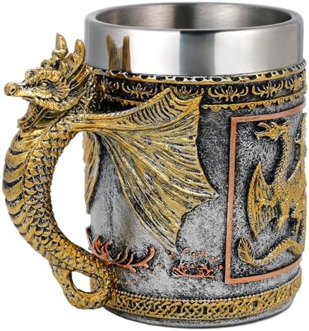 - PREMIUM CRAFT UPGRADE - The exterior of this medieval roaring dragon mug is made of high-quality resin. The interior is made of 304 stainless steel lining and is fixed, holding up to 15.8 oz. The mouth of the cup is thick and smooth, with an increased height of 0.6 inches. When drinking, your lips will not touch the cup body, making it more comfortable and safer.It works well for drinking beer, wine, coffee, milk or teas.