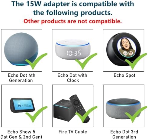 - 【COMPATIBILITY】:Power adapter compatible with the Echo Dot 4th Generation, Echo Dot 3rdGeneration, Fire TV Cubte, Echo Show 5 (1st Gen & 2nd Gen), Echo Spot and Echo Dot with Clpck.