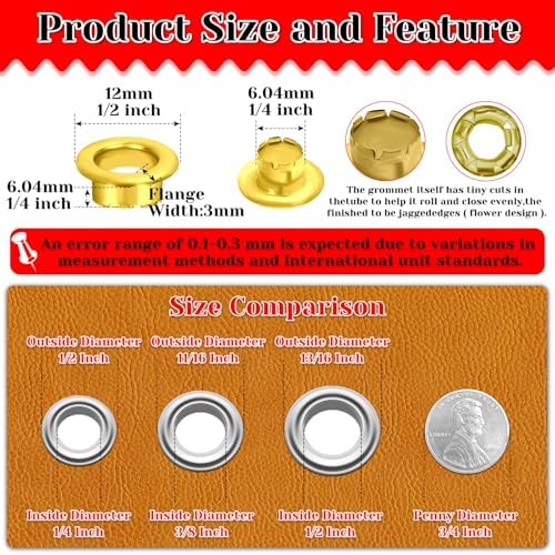 Specifications: Material: metal Grommet Outside Diameter: 1/2 inch Grommet Inside Diameter: 6.4mm, nearly 1/4 inch Grommet Flange Width: ~3mm Color: as pictures shown Material: The eyelet pliers are made of Carbon steel, chrome-plated on the surface, the handle of eyelet pliers is plastic-impregnated, which is comfortable to grip, easy to use and effortless. Package Content: - 400pcs gold and silver Metal Eyelets - 400pcs Washers - 1x Portable Handheld Manual Grommet Pliers Features: - Carbon steel construction and special anti-friction plastic material, durable and easy holding - Easy to use and portable, can be put in the kit to take to any place - With the correct opening angle, you can press it by only one hand - Manual eyelet puncher in light weight is very easy to take and convenient to use because of its redirecting transmission Warm Tips:- The metal grommets are light duty, more for decoration, can’t hold heavy pulling. This grommets kit is ideal for 1-3 mm thick materials like leather, tarps, shoes, elastic bands, paper cards, and hanging crafts. Not suitable for fabrics or cloth. - Please choose the right size that you need according to the product dimension description(Inside Dia: 6.4mm / Outer Dia: 12mm (A.I.S.) / Flange Width: ~3mm). - You need to punch holes with a punching tool before using the buttonhole and pliers. You cannot skip the hole punch. The grommets aren't heavy duty enough to be the hole punch and the grommet. - Please pay attention to the direction of the buttonhole and the pliers, the wrong direction will cause damage to the buttonhole and make the pliers bend. Do not press too hard when using the pliers, the handle will bend. The grommet kit is light duty, not for heavy duty - Add the washer to the grommet, which can help make eyelets stronger, and not easy to loosen. - The bottom of the eyelets is a flowering design, it is not a defective effect, please kindly note.
