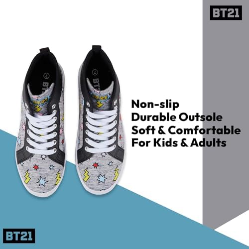 - Personaje favorito con suela de goma 100% algodón: mantén tus pies cómodos con estas zapatillas altas con cordones BT21 con los personajes favoritos de BT21: Koya, Rj, Shooky, Mang, Chimmy, Tata, Cooky y Van. Cada zapatilla tiene gráficos coloridos con tu estilo de BT21.