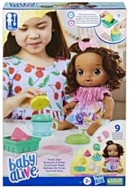 ¡Diversión de pretender juicing y peinado de cabello! Con la muñeca Baby Alive Fruity Sips, los niños pueden usar el jugo pretender y el accesorio de taza para beber para alimentar a su muñeca Baby Alive ¡Esta muñeca bebe y “hace pipí”, como un bebé. ¡Este muñeco de 12 pulgadas para niñas de 3 años viene con accesorios Baby Alive, como un jugo pretender con 2 frutas de plástico (limón y sandía) que los niños pueden sumergir en agua y exprimir. Simplemente reemplaza la tapa del jugo con la tapa de la taza para beber y alimenta a la muñeca Fruity Sips ¡Luego es hora de cambiar el pañal, ya que esta muñeca bebe y hace pipí, como un bebé. (Pañales adicionales para muñecas vendidos por separado.) Los niños de 3 años en adelante pueden guardar los accesorios de la muñeca bebé de frutas pretender en la canasta de frutas de plástico para una limpieza fácil. También viene con un colorido atuendo Baby Alive inspirado en frutas. Un regalo increíble para niñas y niños, los niños van a adorar usar el peine y la barretina incluidas para peinar y arreglar esta muñeca bebé con cabello.
