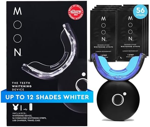MOON Teeth Whitening Kit, LED Light Teeth Whitener Device, 56 White Strips, USB Charger & Travel Case, Blue Light Whitening Tray Removes Stains & Whitens Up to 12 Shades in 2 Weeks (4 Piece Kit)