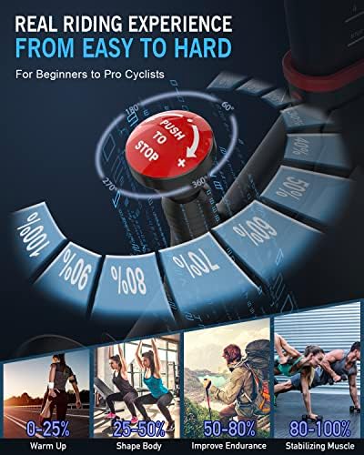 - 100 MICRO-ADJUSTABLE RESISTANCE: Resistance system gives you the experience of a realistic, real-road feeling. Simply turn the knob to increase or decrease the adjustment to the different levels that best suit you.Riding can burn fat quickly, build core muscles and strengthen heart, but reduce injuries