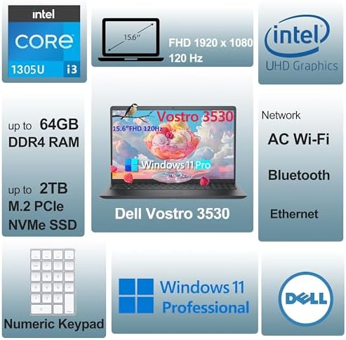Dell 15 15.6" Laptop Computer for Home and Business Student, 13th Gen Intel 5-Core CPU (Beat i5-1145G7), 32GB DDR4 RAM, 1TB PCIe SSD, Vostro 3530 120Hz FHD, WiFi, RJ45, Type-C, HDMI, Windows 11 Pro