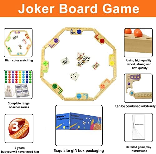 Juego de Tablero de Madera Real de Piezas y Bromas de Marbles and Jokers (Pino) para 2-8 Jugadores 8 Tableros de Juego 8 Colores 40 Bolas 4 Cajas de Cartas