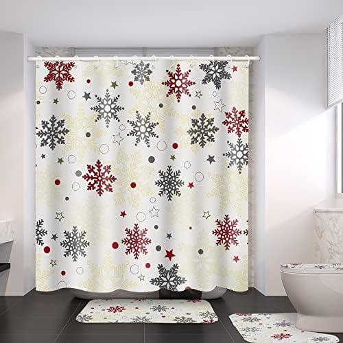 Rtteri 4 Pcs Christmas Shower Curtain Set Snowflakes Shower Curtain with Non Slip Rug Toilet Lid Cover Bath Mat Christmas Bathroom Sets with 12 Pcs Hooks for Xmas Holiday Bathroom Decor, 72 x 72 Inch