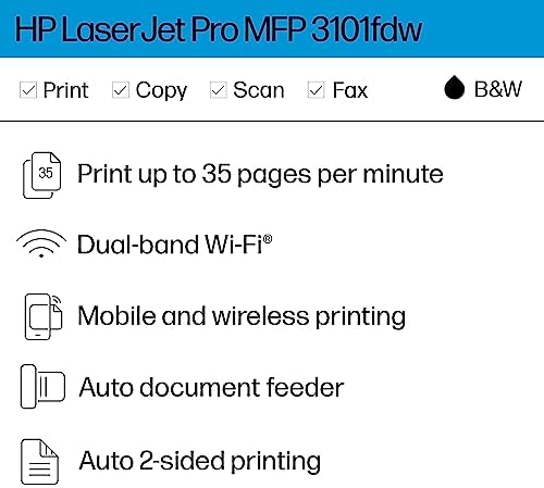 HP LaserJet Pro MFP 3101fdw Wireless Black & White All-in-One Laser Printer, Scanner, Copier, Fax, Best-for-Office (3G628F)