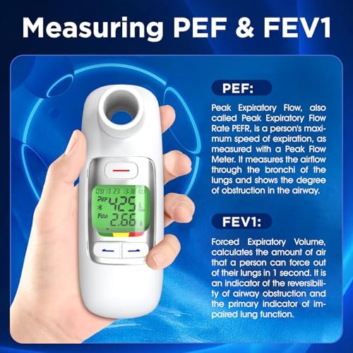 - Digital peak flow meter with green backlight: Large PEF and FEV1 font for easy viewing, Get high accuracy and fast PEF and FEV1 readings in just one second