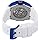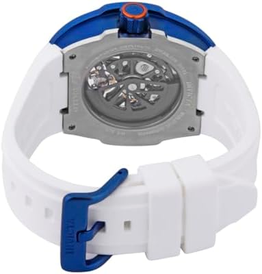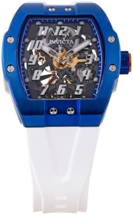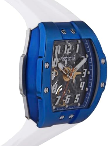 Transparent and Blue dial enhanced by silver-tone hands. Silver-tone and Blue stainless steel case with a white silicone band. Automatic movement. 50 meters / 165 feet water resistance. Fixed bezel. Flame Fusion crystal. Transparent See Through caseback. Buckle clasp. Pull / Push crown. Case size 44 mm x 16 mm. Band 26 mm x 8.25 incheslong. Invicta 43517 S1 Rally Watch.