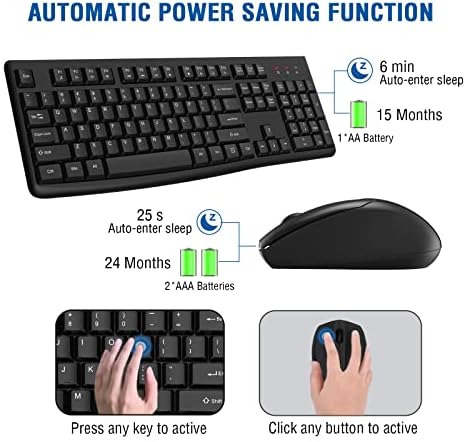 - 【Auto Power Saving Function】EDJO wireless keyboard mouse combo has auto power saving function, when the keyboard is inactivity more than 6 minutes and the mouse is inactivity more than 25 seconds, they will enter sleeping mode separately to save power, which effectively extends the battery life. It can wake up the keyboard by pressing any key, activate the mouse by clicking any button. Note: The keyboard requires 1 AA battery and mouse requires 2 AAA batteries. (battery not included)