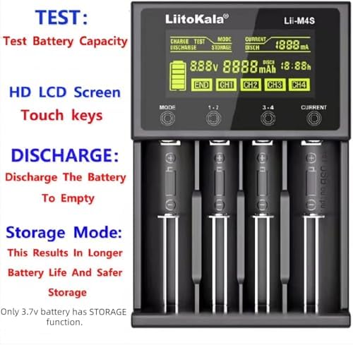 Cargador de batería LiitoKala Lii-M4S Cargador inteligente universal LCD para 18650 26700 26650 21700 AA Cargador de botón táctil LCD para probar la capacidad de la batería. Este cargador de batería es una herramienta esencial para todos los entusiastas de las baterías recargables. Con una pantalla LCD de alta calidad, este dispositivo ofrece una monitorización precisa y una operación intuitiva para garantizar la seguridad y eficiencia en la carga de tus baterías.
