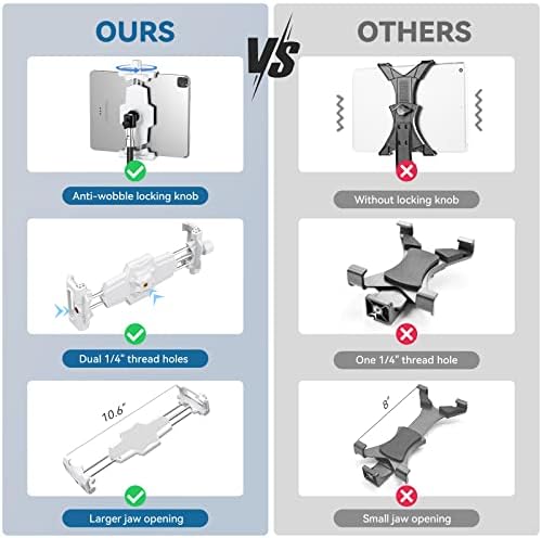 - 【More Stable & Secure】The upgraded iPad tripod mount adapter is built-in reinforcing rib in the middle of the base. Powerful spring-loaded arms and large jaws combined to make sure your device being held steadily. Moreover, the iPad clamp mount base and jaws are covered with non-slip pads to protect your device from scratches and slips, reducing the risk of its falling.