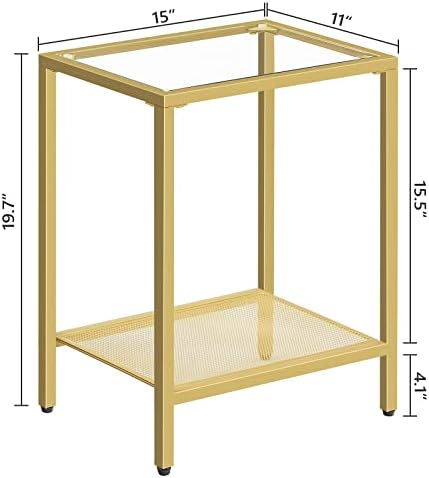 Mesa auxiliar MAHANCRIS, mesita de noche de 2 niveles con estante de malla, mesa auxiliar de sofá con tapa de vidrio templado, mesa con bandeja de TV para espacios pequeños, mesa auxiliar para aperitivos, mesita de noche para dormitorio, sala de estar, dorada ETJ24B01
