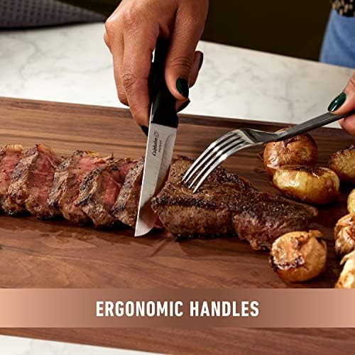 The Calphalon Premier 8-Piece Steak Knife Set delivers exact cuts and lifelong durability. Stamped from a single piece of high-carbon Asian steel that resists rust, stains, and discoloration, these steak knives feature a semi-serrated edge for smooth and efficient knife cuts. A full-tang design provides excellent balance and superior strength, while ergonomically contoured, comfort-grip handles fit firmly and comfortably in your hand to help reduce hand fatigue while in use. This selection of steak knives is designed for precision and resilience while taking on any task with ease, from slicing tomatoes to cutting through a thick piece of meat and more. Built to last and complement modern cookware, this steak knives set of 8 is backed by a full lifetime warranty. Designated Chemical Disclosure: This product contains Stainless Steel (Iron, Chromium, Molybdenum, Manganese, Vanadium, Nickel, Phosphorus).