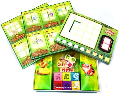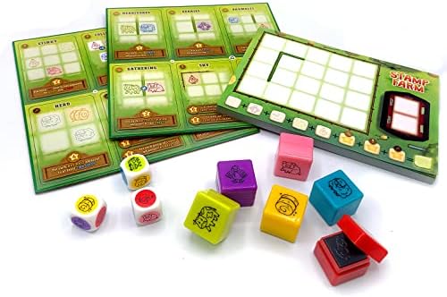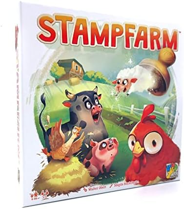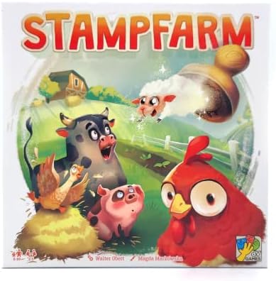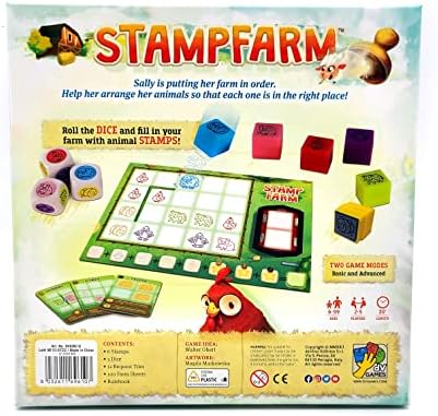 - Stampfarm es un juego de "lanzar y sellar" que incluye seis sellos de colores que muestran vaca, ganso, gallina, cerdo, oveja y bala de heno.