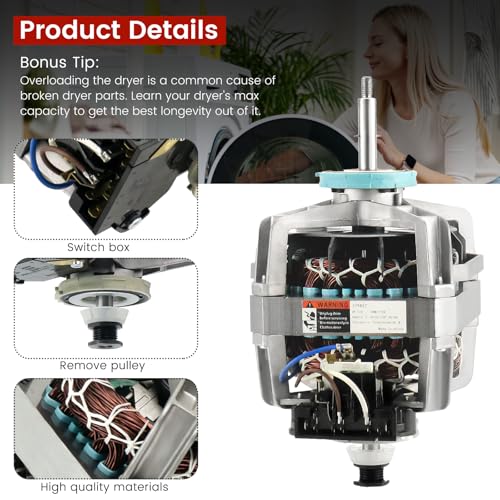 - 【UPGRADED BLOWER SHAFT LENGTH】Dryer Drive Motor powers the drum of the appliance during the drying cycle. The UPGRADE GENUINE Replacement WhirlPool 279827 Dryer Drive Motor with Pulley is used in models since 1965. Blower shaft length is 2-2/8",featuring a robust 1/3 HP motor and a rapid 1725 RPM rotation, this dryer motor ensures speedy and efficient clothes drying. It operates quietly With noise levels below 65 db, this dryer drive motor provides a peaceful user experience, allowing you to use it without disruptions. And features overload protection, ensuring hassle-free drying without loud noise disturbances or concerns about overheating