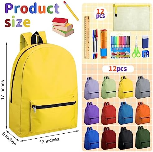 Silkfly 12 Pcs 17" Backpacks with 144 Pcs School Supplies Kits Includes Markers Scissors Rulers Sharpeners Ballpoint Pens Erasers Pencil Cases Pencils for Elementary Middle High School